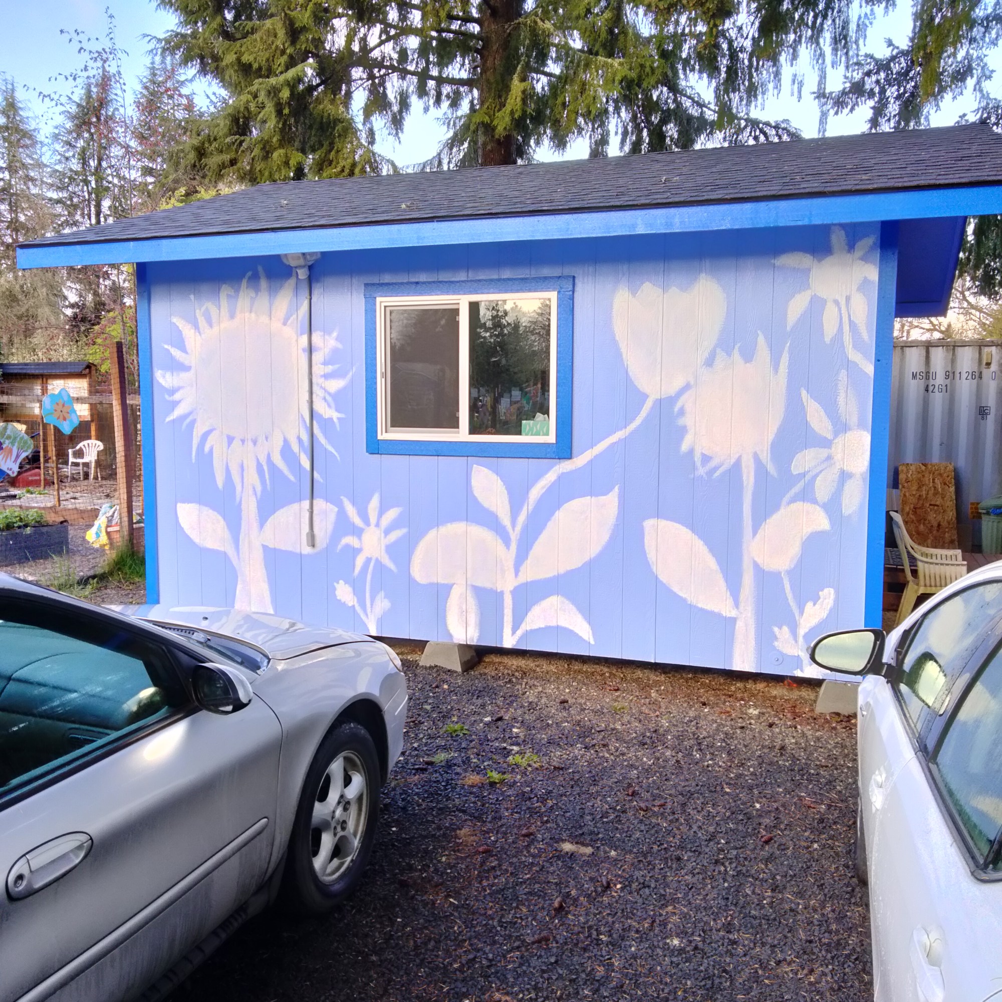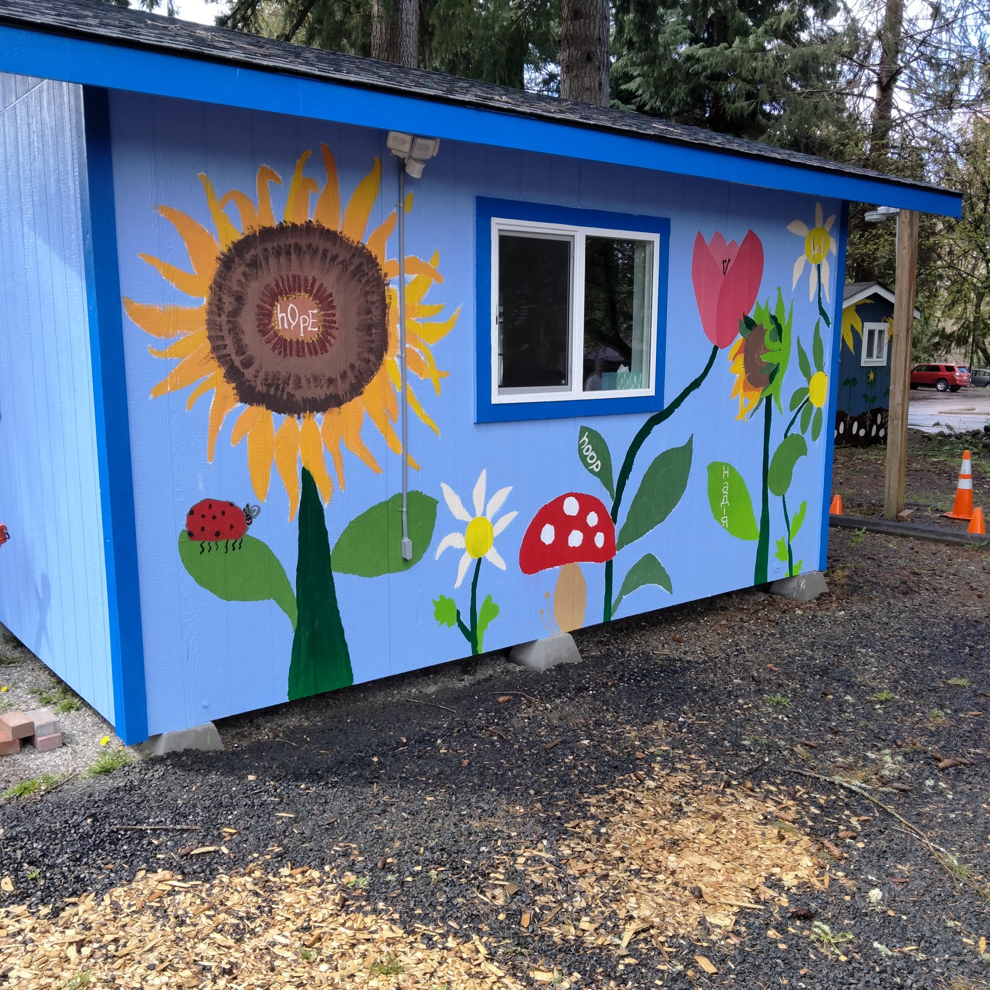 In April, with the help of numerous volunteers of all ages from WPC, Hope Village and the greater Olympia community, these scenes on the Hope Village Office and Community Center were painted!